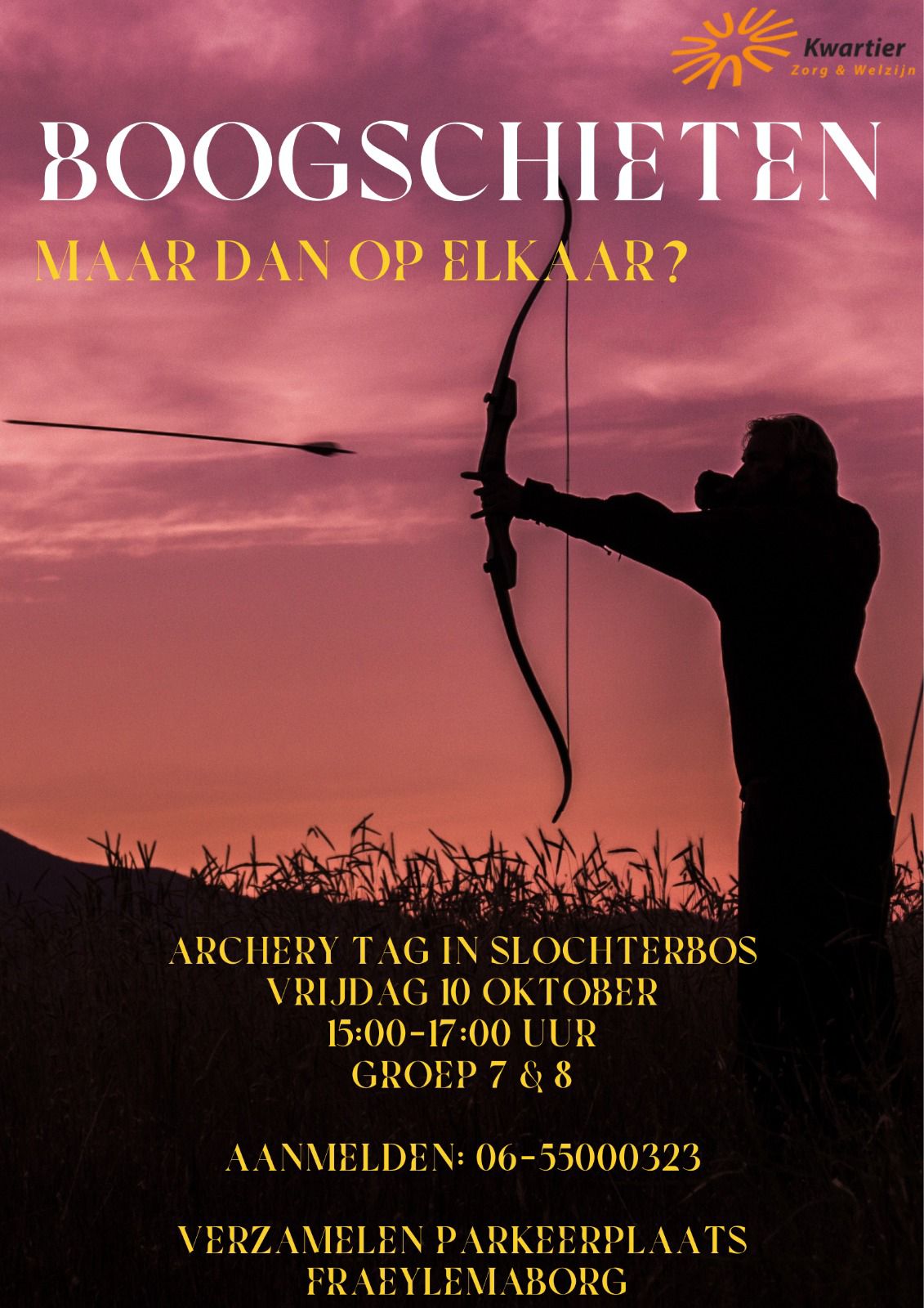 Uw locatie: Home → Activiteiten → Boogschieten (voor groep 7 en 8) Gegevens Datum: 10 oktober Tijd: 15:00 - 17:00 Evenement Categorie: Jongeren Locatie: Slochterbos
