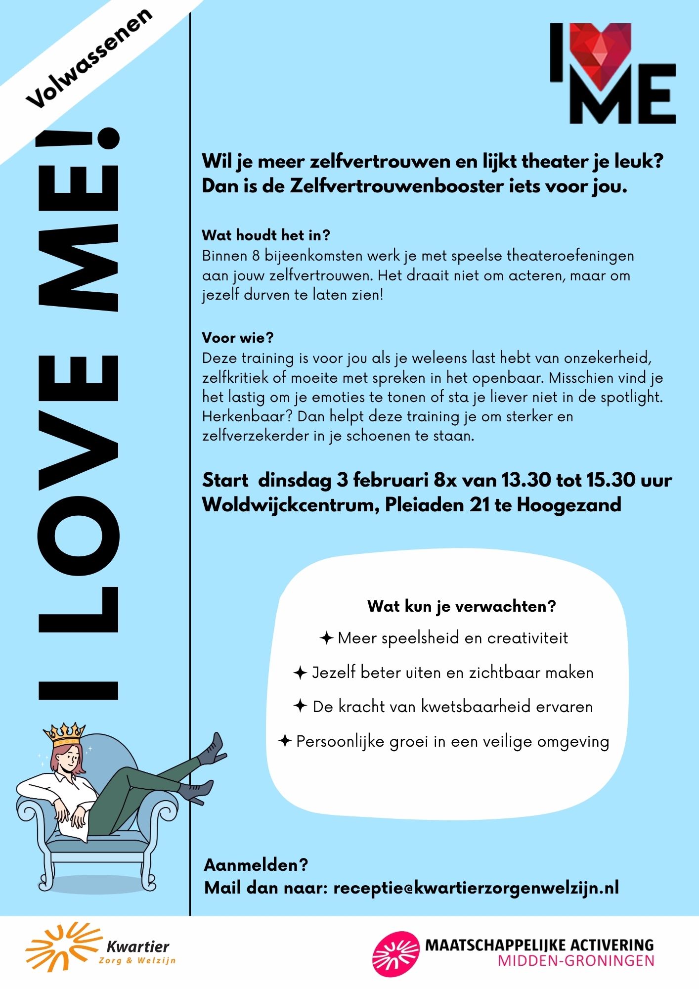 Aanmelden kan via receptie@kwartierzorgenwelzijn.nl of door contact op te nemen met Brenda!